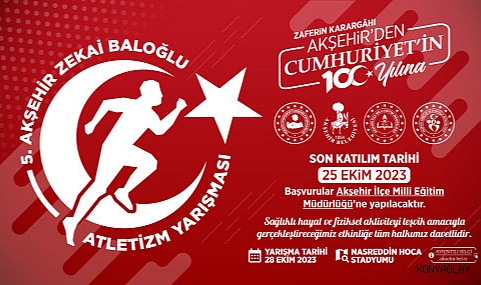 Akşehir Kaymakamlığı, Akşehir Belediyesi, Akşehir Gençlik ve Spor İlçe Müdürlüğü ve Akşehir İlçe Milli Eğitim Müdürlüğü işbirliği ile sağlıklı hayat ve fiziksel aktiviteyi teşvik amacıyla gerçekleştirilen Akşehir Zekai Baloğlu Atletizm Yarışması’nın beşincisi, 28 Ekim 2023 Cumartesi günü, Akşehir Nasreddin Hoca Stadyumu’nda gerçekleştirilecek.