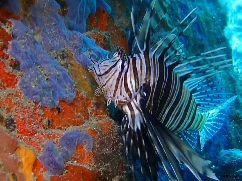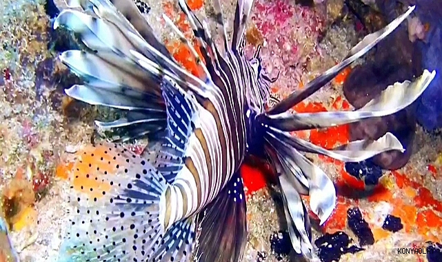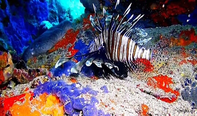 Su ürünleri mühendisi ve profesyonel dalgıç Nedim Kartal, 12 metre derinlikte dikenleri zehirli, istilacı bir tür olan aslan balığını görüntüledi.