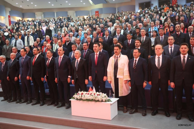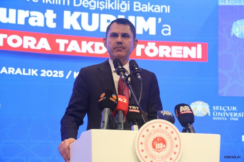 Selçuk Üniversitesi Sultan Alparslan Kültür Merkezi 30 Ağustos Salonu'nda düzenlenen fahri doktora takdim törenine katılım yoğun oldu. Törende konuşan Çevre, Şehircilik ve İklim Değişikliği Bakanı Murat Kurum, yıllar önce öğrencisi olduğu Selçuk Üniversitesi'nin düzenlediği fahri doktora takdim töreninde bulunmakta duyduğu memnuniyeti ifade ederek, "Üniversiteler, kuruldukları şehrin mirasını geleceğe taşıyan güzide kurumlardır. Selçuklu başkenti Konya'mızın ruhunu her yönüyle sindirmiş, ülkemizin en saygın ilim ve irfan ocağı olmuş Selçuk Üniversitemiz, bunun en güçlü örneklerinden biridir. Çünkü, asırlardır alim ile devlet adamı arasındaki köklü bağ bu topraklarda serpilmiş, gelişmiş ve bir kültür haline gelmiştir. Bu bakımdan Konya, hem devleti hem ilmi, hem devlet adamını hem de alimi temsil eden bir medeniyet merkezidir. Üniversite yıllarımda ve sonrasında üstlendiğim her görevde, bu şehrin tecrübesi ve bu okulun kazandırdığı bilinç, daima yol göstericim olmuştur. Bu nedenle, Selçuk Üniversitesi'nin takdir ettiği bu fahri doktora ünvanını, her zaman gururla, onurla, şerefle taşıyacağım" dedi.