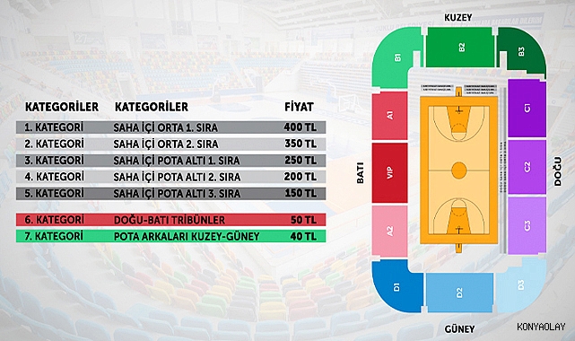 Taraftarlar, 5 Şubat Pazar günü saat 15.30’da oynanacak maçın biletlerini passo.com.tr ve Passolig gişelerinden satın alabilecek. Bİletler ayrıca maç günü saat 13.00 itibariyle de Selçuklu Belediyesi Spor Salonu'nun gişelerinden satışa sunulacak.http://www.passo.com.tr ’de satışa çıkan Fenerbahçe Beko maçı bilet fiyatları şöyle:KATEGORİLER KONYASPORFENERBAHÇE BEKO 05.02.2023 1. KATEGORİ SAHA İÇİ ORTA 1. SIRA 400 ₺2. KATEGORİ SAHA İÇİ ORTA 2. SIRA 350 ₺3. KATEGORİ SAHA İÇİ POTA ALTI 1.SIRA 250 ₺4. KATEGORİ SAHA İÇİ POTA ALTI 2.SIRA 200 ₺5.KATEGORİ SAHA İÇİ POTA ALTI 3.SIRA. 150 ₺6. KATEGORİ DOĞU-BATI TRİBÜNLER 50 ₺7. KATEGORİ POTA ARKALARI KUZEY-GÜNEY 40 ₺