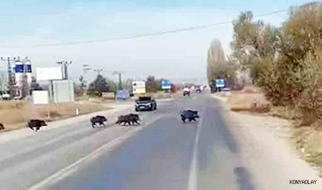 Beyşehir Isparta Kara yolunda seyir halinde olan bir aracın sürücüsü, yola aniden çıkan yaban domuzu sürüsünü görünce hızını düşürdü. Sürücü, yolun karşısına koşarak geçmeye çalışan yaban domuzu sürüsünü cep telefonuyla kaydetti. O anlarda sürücünün "burayı domuzlar bastı" sözleri de kayda yansıdı. Her iki yönde de seyir halinde olan araçların olduğunun görüldüğü video kaydında, karşıya geçen domuz sürülerinin bir bahçe evinin önünden tali yola girerek ilerleyişini sürdürmesi dikkat çekti. Ali Rıza Önses- KONYA (İHA) -