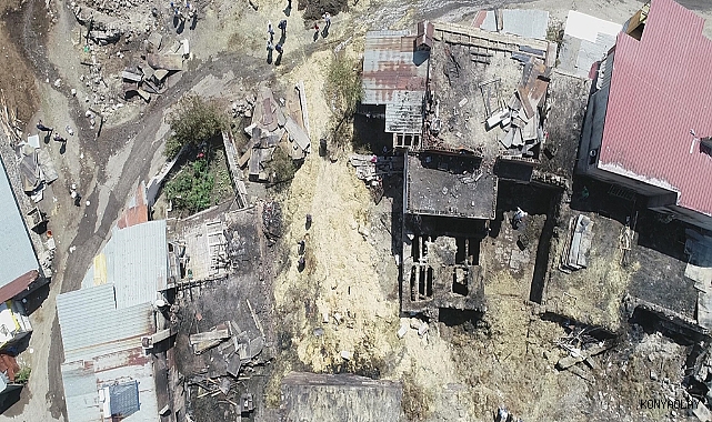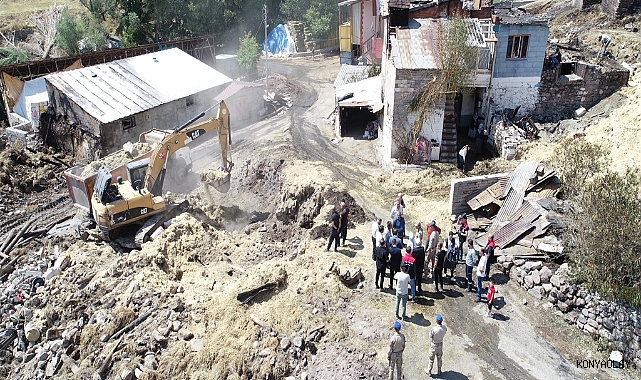 Erzurum'un Yakutiye ilçesinde dün yangında 10 ev ve 17 ahırın yandığı, 16 büyükbaşın da öldüğü kırsal Kırmızıtaş Mahallesi'nde hem hazar tespit çalışması hem de iş makineleriyle temizlik yapılıyor.