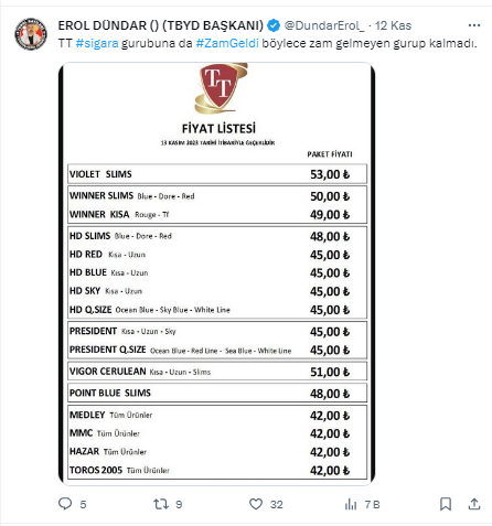 Sigara gruplarına arka arkaya gelen zamlara bir sigara grubu daha eklendi. Zammı Tekel Bayileri Yardımlaşma Derneği Başkanı Dündar, sosyal medya hesabı üzerinden açıkladı.Daha önce JTİ, BAT, Philip Morris, Imperial Tobacco gruplarına 5 TL zam geldiğini açıklayan Dündar, bugün de TT grubuna zam geldiğini kaydetti. Dündar, X (Twitter) hesabından yaptığı duyuruda “TT grubuna da zam geldi. Böylece zam gelmeyen grup kalmadı” dedi.