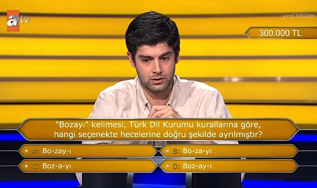 Yarışmada yöneltilen sorular yalnızca yarışmacıları değil, ekran başındaki izleyicileri de düşündürüyor. Her bölümde farklı alanlardan gelen sorular sayesinde izleyiciler hem eğleniyor hem de yeni bilgiler öğrenme fırsatı yakalıyor. Bu bölümde sorulan sorulardan biri ise Türkçe heceleme kurallarını gündeme taşıdı: “Bozayı” kelimesi, Türk Dil Kurumu kurallarına göre hangi seçenekte doğru şekilde hecelenir?