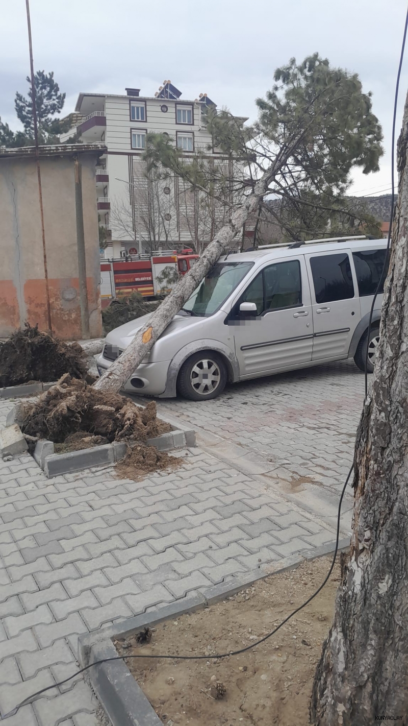 Konya'nın Bozkır ilçesinde etkili olan fırtına çatıları uçurdu, ağaçları devirdi.