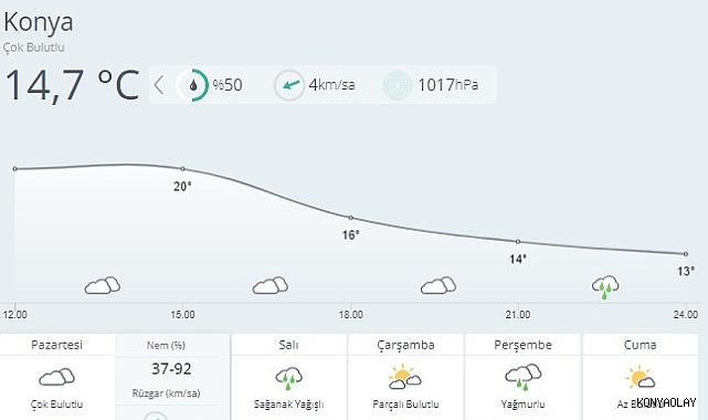 Meteoroloji verilerine göre bu hafta Konya’da hava çounlukla kapalı ve yağılı olacak. Sıcaklığın da üşüş kaydedeceği Konya’da havanın şöyle olması bekleniyor.