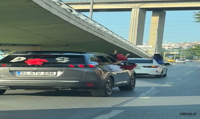 Beyoğlu , Kağıthane, Sarıyer ve Ümraniye’de düğün kutlaması için araçlarla konvoy yapan sürücüler, slalom yaparak trafiği tehlikeye düşürdü. Yolda duraklama yaparak yoğunluk oluşmasına neden olan araçlar ve camlardan sarkanlar cep telefonu kamerasına yansıdı.İstanbul’da çeşitli ilçelerde araçla toplananlar düğün kutlaması için konvoy yaptı. Beyoğlu Sütlüce Mahallesi Karaağaç Caddesi'nde ilerleyen bir düğün konvoyundaki araçlar slalom yaparak trafiği tehlikeye attı. Kağıthane İmrahor Caddesi'nde araçlarla konvoy halinde ilerleyen bir grup ise, araçların camlarından sarktı.Slalom yapıp ; Camdan sarktılar camdan sarktılar Dakikalarca bu şekilde araçla ilerleyerek trafiğe tehlikeye düşüren grup, zaman zaman yavaşlayarak trafiğin durmasına da neden oldu. Sarıyer, Maslak, Büyükdere Caddesi'nde de konvoy yapan bir grup trafiği yavaşlatarak camlardan sarkıp ilerledi. Şile Otoyolu Ümraniye mevkiinde de benzer görüntüler kaydedildi. (DHA)