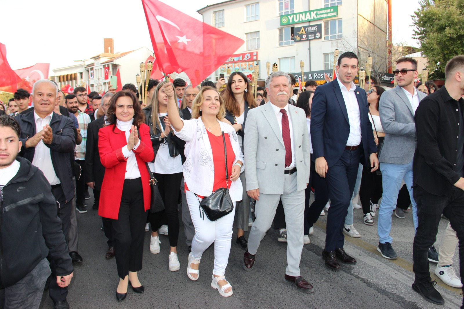 Kılıçaslan Kent Meydanı’nda bandonun çaldığı marşlarla başlayan Büyük Cumhuriyet Yürüyüşü, Anıt alanında çelenk sunumu, saygı duruşu ve İstiklal Marşının okunmasıyla sona erdi.