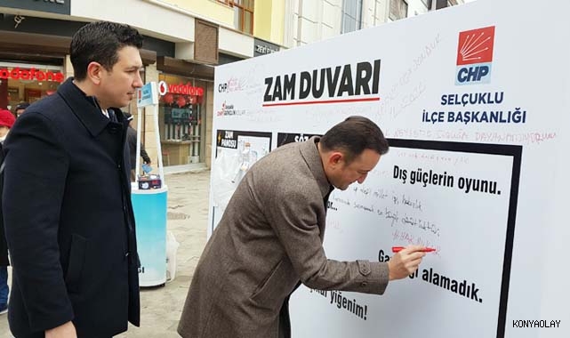 CHP Selçuklu İlçe Başkanlığı gıdadan elektriğe kadar pekçok ürüne gelen zamları protesto edip, zamlara dikkat çekmek amacıyla “Zam Duvarı Eylemi” başlattı. Eylemin, zamların geri kaldırılmasına kadar süreceği açıklandı.
