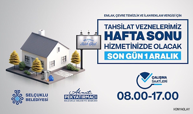 Emlak, çevre - temizlik ve ilan - reklam vergilerinin Mayıs ve Kasım aylarında olmak üzere 2 eşit taksitte ödendiği belirtilerek vergi borcu olan mükelleflerin 1 Aralık tarihine kadar emlak, çevre - temizlik ve ilan - reklam vergilerinin ikinci taksitlerini, TC kimlik numarası ve mükellef sicil numarası ile Selçuklu Belediyesi hizmet binası içerisinde yer alan veznelere nakit veya kredi kartı ile ödeyebilecekleri belirtildi. Açıklamada ayrıca mükelleflerin Türkiye'nin her yerindeki PTT şubelerinden online sistem üzerinden mükellef sicil numarası ve TC kimlik numarası eklenerek ödeme yapabileceği gibi e-belediye uygulaması kapsamında internet üzerinden www.selcuklu.bel.tr web adresinden de kredi kartı veya banka kartı ile vergilerini ödeyebileceklerini hatırlattı.