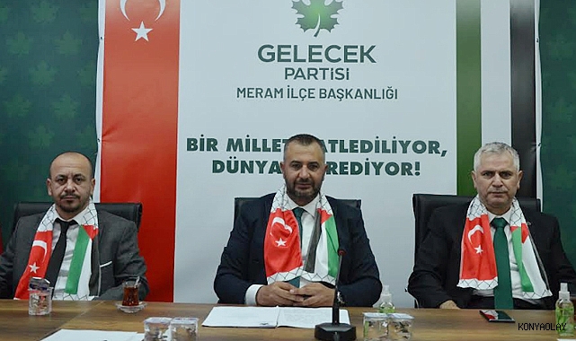 Gelecek Partisi Meram İlçe Başkanı Mert, Türkiye'nin, İsrail’in Filistin’e saldırıları karşısında net bir tavrını koyması gerektiğini belirterek, hükümetin İsrail ile bütün ilişkilerini askıya alıp yapılan anlaşmaları iptal etmesi gerektiğini söyledi