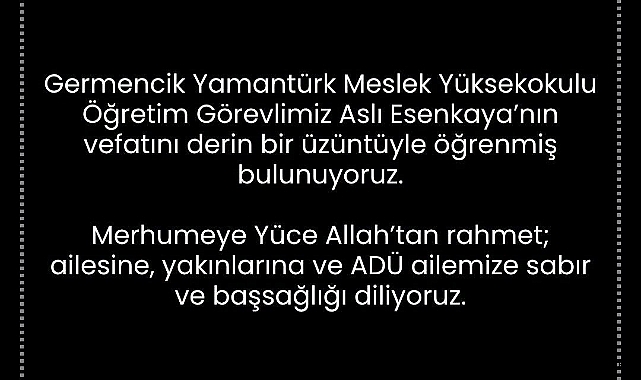 ADÜ Rektörü Prof. Dr. Bülent Kent de sosyal medya hesabından yaptığı paylaşımda, "Germencik Yamantürk Meslek Yüksekokulu Öğretim Görevlimiz Aslı Esenkaya'nın vefatını derin bir üzüntüyle öğrenmiş bulunuyoruz. Merhumeye Yüce Allah'tan rahmet; ailesine, yakınlarına ve ADÜ ailemize sabır ve başsağlığı diliyoruz" ifadelerine yer verdi.