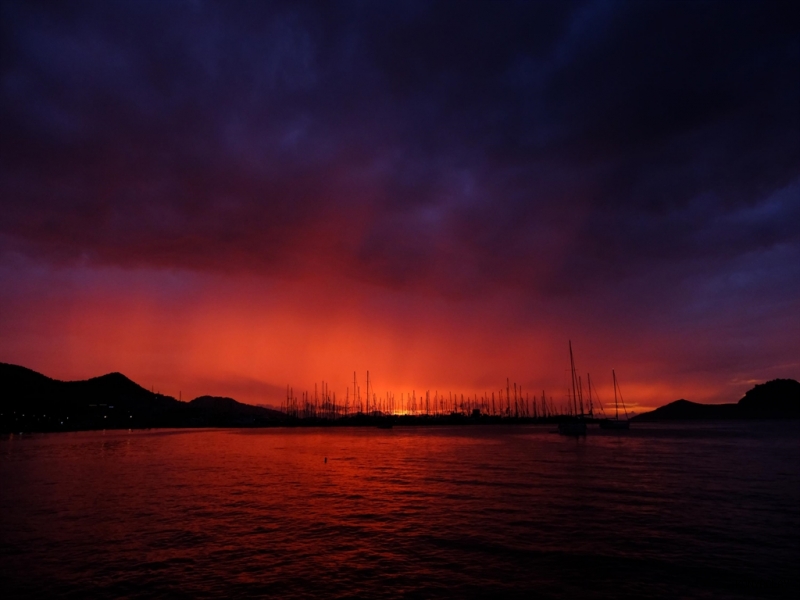 Muğla'da etkili olan sağanak yağış ardından gökyüzü kızıl renge büründü.