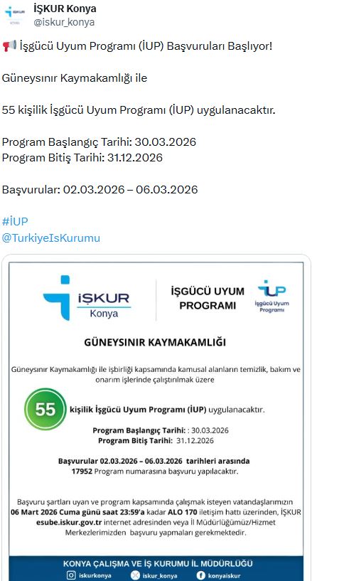Konya Çalışma ve İş Kurumu İl Müdürlüğü (İŞKUR), Güneysınır Kaymakamlığı iş birliğiyle 55 kişilik İşgücü Uyum Programı (İUP) düzenleyeceğini açıkladı.Program Başlangıç Tarihi: 30 Mart 2026Program Bitiş Tarihi: 31 Aralık 2026Başvurular 2 Mart 2026 – 6 Mart 2026 tarihleri arasında alınacak.İŞKUR Konya’nın resmi duyurusunda, “İşgücü Uyum Programı (İUP) Başvuruları Başlıyor!” ifadelerine yer verildi.Program kapsamında katılımcılara mesleki uyum ve istihdam desteği sağlanması hedefleniyor.Başvuru yapmak isteyenler, belirtilen tarihler arasında İŞKUR üzerinden işlemlerini tamamlayabilir.Detaylı bilgi için İŞKUR Konya İl Müdürlüğü ile iletişime geçilmesi tavsiye edildi.