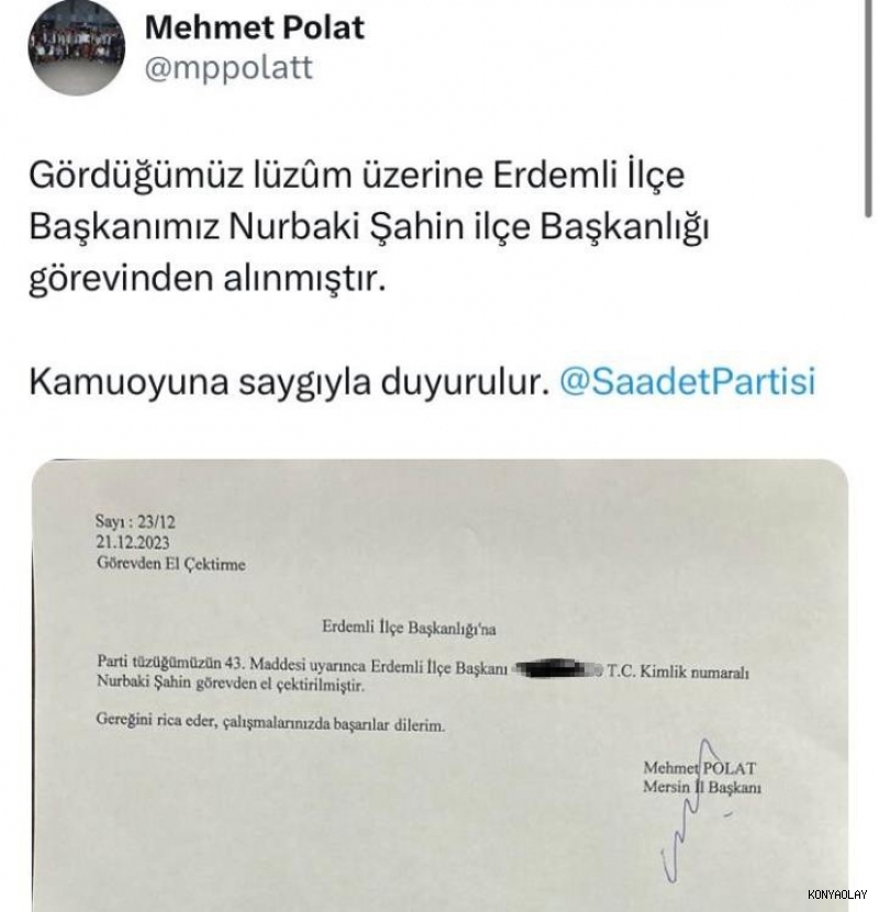 Saadet Partisi Mersin Erdemli İlçe Başkanı Nurbaki Şahin görevden alındı. Görevden almayı Saadet Partisi Mersin İl Başkanı Mehmet Polat sosyal medyadan duyurdu. Polat açıklamasında, ”Gördüğümüz lüzum üzerine Erdemli İlçe Başkanımız Nurbaki Şahin ilçe başkanlığı görevinden alınmıştır” ifadelerini kullanırken, alınma nedenini açıklamadı. Alınma nedeni ise -Saadet Partisi Genel Başkanı Temel Karamollaoğlu'nun bir televizyon programında yaptığı açıklama ile ortaya çıktı.