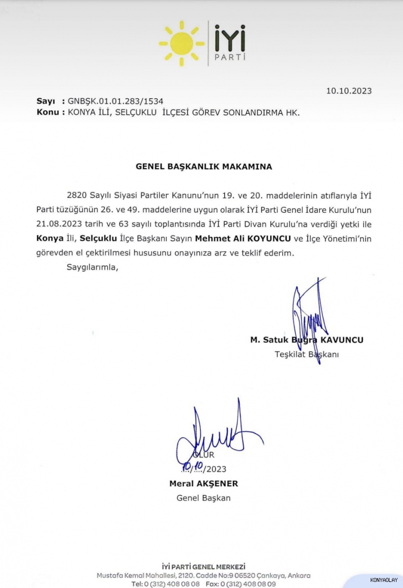 İYİ Parti Konya Selçuklu ilçe başkanı başta olmak üzere bazı ilçe başkanları görevden alındı.
