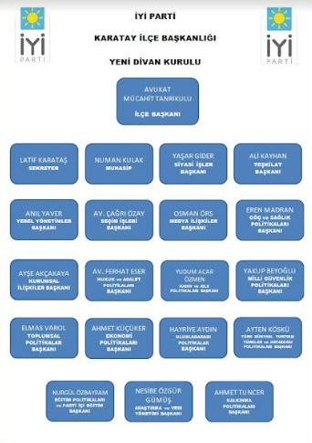 Konya'nın tanınmış avukatlarından Mücahit Tanrıkulu, gçtiğimiz günlerde İYİ Parti Karatay ilçe başkanlığı görevine getirilmişti. Tanrıkulu, yönetimini belirledi.Başkanlık görevine getirildiği ilk günden bu yana hummalı bir çalışma içine giren Tanrıkulu, "Amacımız partimizin iktidar olması için üzerimize düşen görevleri eksiksiz olarak yerine getirmektir. Halka hizmet Hakka hizmet düsturu ile çıkağımız bu yolda hedef halkımıza hizmet etmektir. Yönetimimizi oluşturduk. Görevimize başladık. Rabbim hayırlı çalışmalara imza atmayı nasip etsin" dedi.İşte İYİ Parti Karatay İlçe Teşkilatı'nın yeni yönetimi: