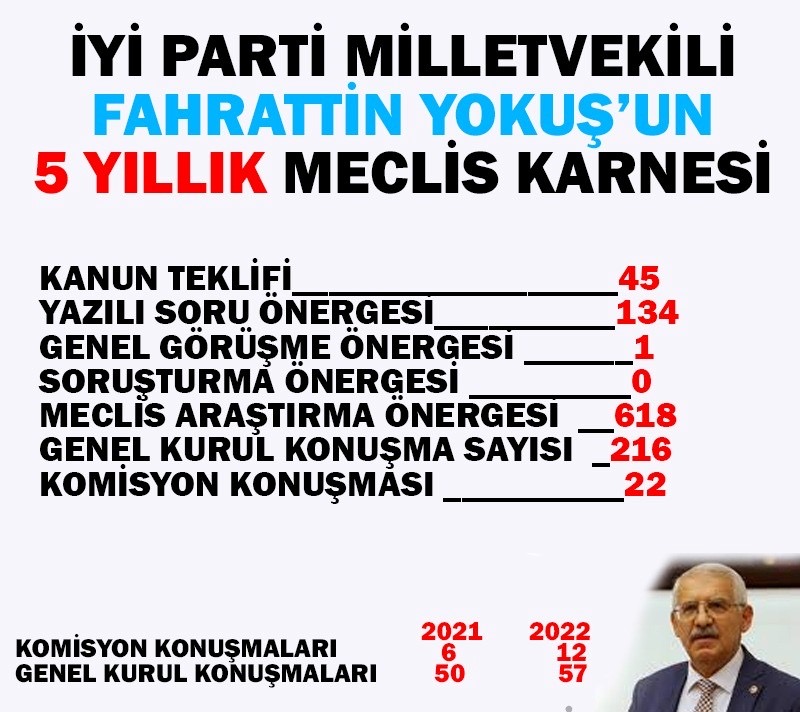 24 Haziran 2018 tarihinde yapılan genel seçimlerde Konya, AK Parti’den 10, MHP’den 2, Saadet Partisi, CHP ve İYİ partiden birer milletvekili olmak üzere toplamda 15 Milletvekilini T.B.M.M’ye gönderdi. Bölge milletvekillerinden Fahrettin Yokuş, seçilen 15 vekil içinde Meclis’te ve bölgesinde göstermiş olduğu performans ve çalışmalarla sık sık gündeme geldi.HER KESİMDEN VATANDAŞIN SESİ OLMAYA ÇALIŞTISeçim bölgesi Konya’yı yakından takip eden ve Konyalıların sorunlarını yerinde tespit eden Fahrettin Yokuş, kentin 31 ilçesinde yaşanan sorunları Meclis’e taşıdı. Geçmişte Türkiye Kamu-Sen Genel Sekreteri ve Türk-Büro-Sen Genel Başkanlığı görevlerini de yürüten Yokuş, Konya ve ülke genelindeki çiftçilerin, işçilerin, memurların, emeklilerin ve polislerin sorunlarını da yakından takip ederek sorunların çözüme kavuşması adına birçok çalışma yürüttü. AÇIK ARA FARK ATTIFahrettin Yokuş’un çalışmaları meclis karnesine de yansıdı. Yokuş, yaklaşık 5 yıllık milletvekilliği sürecinde mecliste yaptığı çalışmalarla Konyalı diğer 14 milletvekiline açık ara fark attı. Yokuş, TBMM Genel Kurulu’nda 5 yıl içerisinde ant içmesi dışında 216 defa konuşurken, komisyonlarda ise 22 kez söz aldı. Konya Vekillerinin Genel Kurul konuşmaları dışında yasama faaliyetlerine baktığımızda ise İYİ Parti Milletvekili Fahrettin Yokuş, verdiği 45 Kanun Teklifi, 134 adet Soru Önergesi ve 618 Araştırma Önergesi ile diğer milletvekillerine açık ara fark attı.