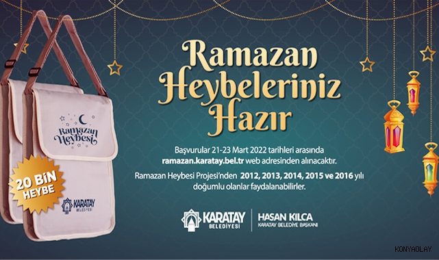 “Ramazan Heybeleriniz Hazır” projesi kapsamında Karatay Belediyesi, ramazan.karatay.bel.tr adresine kayıt yaptıran 2012, 2013, 2014, 2015 ve 2016 yılı doğumlu 20 bin Karataylı çocuğa “Ramazan Heybesi” hediye edecek.