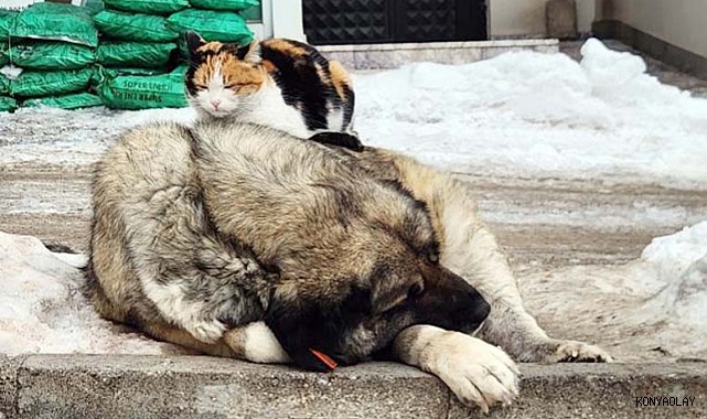 Soğuk havada bir kedinin, uyuyan bir köpeğin sırtında durduğu anlar görenlerin içini ısıttı.