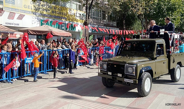 Sabah Atatürk anıtına çelenk sunumuyla başlayan kutlamalar, Feritpaşa Caddesi'nde yapılan yürüyüş ile devam etti. Buradaki program Konya Valisi Vahdettin Özkan ve Büyükşehir Belediye Başkanı Uğur İbrahim Altay'ın vatandaşları selamlamasıyla başladı. Saygı duruşu ve İstiklal Marşı'nın okunmasıyla devam eden programda Cumhurbaşkanı Recep Tayyip Erdoğan'ın Cumhuriyet Bayramı mesajı da okundu.Törende Konya Valisi Vahdettin Özkan da günün anlam ve önemini belirten bir konuşma yaptı. Vali Özkan, konuşmasında "Hepimiz biliyoruz ki; tarihte eşine ender rastlanan bir azim ve iradenin timsali olan İstiklal Harbimiz, milletimizin bağımsızlığa olan düşkünlüğünün ve vatan topraklarının bölünemeyeceğinin tarihi bir ispatıdır. 29 Ekim 1923, çağ açıp kapatmaya mazhar olmuş bir milletin büyük fedakarlıklarla kazandığı milli mücadelesinin cumhuriyet ile taçlandırıldığı gündür. Cumhuriyet'in bütün vatandaşları kanun önünde eşit sayması, devlet yönetimine eşit olarak katılımını sağlaması milli birlik ve beraberliğimiz açısından birleştirici, pekiştirici olmuş, asırlar boyu hürriyetinden ve onurundan taviz vermeyen milletimiz, kadim tarihinin kahramanlıklarla dolu mirasını da baş tacı yaparak, geleceğe doğru emin adımlarla yol almıştır. Birlik ve beraberlik içerisinde, cumhuriyetimizi bütün değer ve kurumlarıyla özümsemiş olan milletimiz, Türkiye'yi çağdaş dünya devletleri içinde hak ettiği saygın konuma yükseltmek için gerekli olan iradeyi her zaman ortaya koymuştur. Bu yüksek şuur, irade, azim, vizyon ve cesareti gösterebildiğimiz takdirde Türkiye'nin, yeni dünya düzeninde değişimi takip eden değil, şekillenmesine katkıda bulunan bir ülke olacağına inancımız tamdır" dedi.Programda öğrenciler halk oyunları gösterisi yaptı. Kompozisyon yarışmasında dereceye giren öğrencilere de Vahdettin Özkan tarafından ödülleri verildi.Askeri ve mülki erkan, öğrenciler ve vatandaşların büyük ilgi gösterdiği program geçit töreniyle sona erdi.