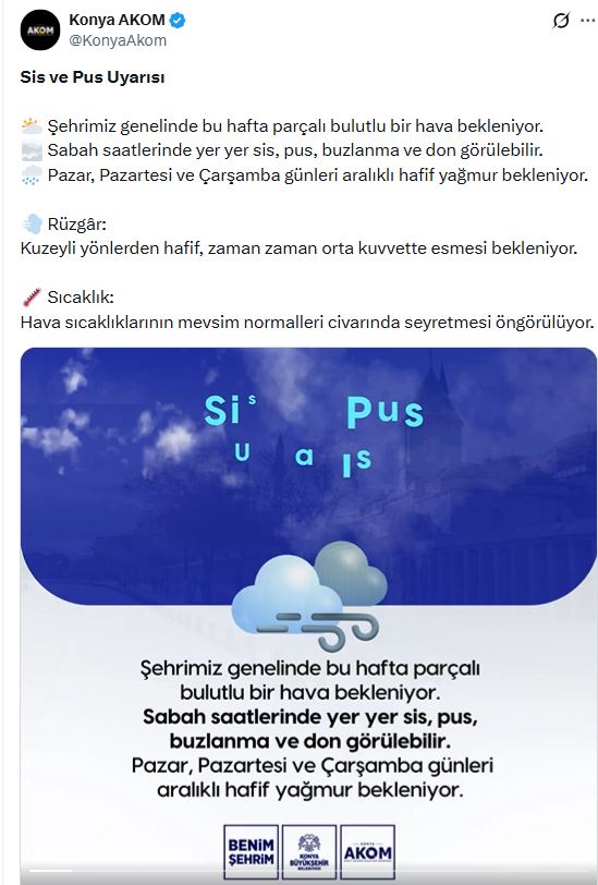 Konya Büyükşehir Belediyesi bünyesinde faaliyet gösteren Afet Koordinasyon Merkezi (AKOM), şehri etkisi altına alması beklenen yeni hava sistemine dair kapsamlı bir rapor yayımladı.Geçtiğimiz günlerde mevsim normallerinin üzerinde seyreden hava sıcaklıkları, yerini tipik bir İç Anadolu kışı senaryosuna bırakıyor. Hafta sonu başlayacak olan bu değişim, özellikle ulaşım ve tarımsal faaliyetler açısından kritik riskler barındırıyor.Konya, geçtiğimiz hafta parçalı bulutlu ve sakin bir hava trafiği yaşamıştı. Ancak Balkanlar ve kuzey üzerinden gelen nemli havanın, bölgedeki soğuk zeminle birleşmesi sonucunda "sis ve pus" oluşumu kaçınılmaz hale geldi.AKOM yetkilileri, özellikle sabahın ilk ışıklarında görüş mesafesinin bazı bölgelerde 50 metrenin altına düşebileceği konusunda uyarıda bulunuyor. Geçmiş yıllarda benzer hava koşullarında yaşanan zincirleme trafik kazaları göz önüne alındığında, bu uyarının önemi bir kat daha artıyor.Detaylı Hava Analizi ve RisklerAKOM tarafından paylaşılan verilere göre, konya genelinde hafta boyunca parçalı bulutlu bir gökyüzü hakim olacak. Ancak tablodaki en dikkat çekici detaylar buzlanma ve don olayları. Özellikle yüksek kesimlerde ve ana arterlerde sabah saatlerinde oluşacak gizli buzlanmanın, sürüş güvenliğini tehdit etmesi bekleniyor.Haftalık Tahmin ve Beklentiler:Yağış Durumu: Pazar, Pazartesi ve Çarşamba günleri şehrin farklı bölgelerinde aralıklı hafif yağmur geçişleri görülecek. Yağışın zeminle buluştuğu anlarda buzlanma riski tetiklenebilir.Rüzgâr Faktörü: Kuzeyli yönlerden esmesi beklenen rüzgârların, zaman zaman orta kuvvete ulaşarak hissedilen sıcaklığı düşüreceği öngörülüyor.Sıcaklık Grafiği: Termometreler her ne kadar mevsim normallerini işaret etse de, yüksek nem ve sis faktörü vatandaşların soğuğu daha sert hissetmesine neden olabilir.AKOM'dan Resmi AçıklamaYapılan duyuruda şu ifadelere yer verildi:"Sis ve Pus Uyarısı: Şehrimiz genelinde bu hafta parçalı bulutlu bir hava bekleniyor. Sabah saatlerinde yer yer sis, pus, buzlanma ve don görülebilir. Vatandaşlarımızın, özellikle trafiğe çıkacak sürücülerimizin takip mesafelerini korumaları ve kış şartlarına uygun donanımları bulundurmaları önem arz etmektedir."