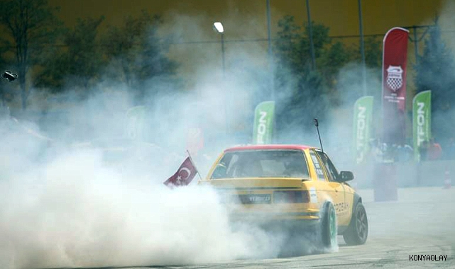 Konya'da slalom yarışı ve drift gösterisinde otomobiller tozu dumana kattı