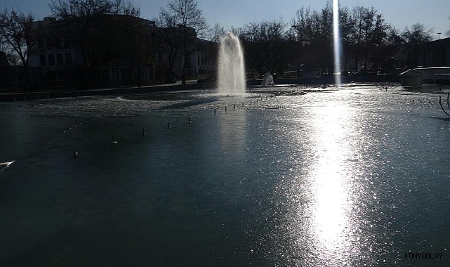 Konya'da soğuktan süs havuzları buz tuttu