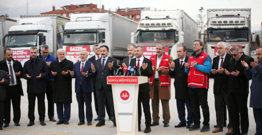 Programa katılan Diyanet İşleri Başkan Yardımcısı Prof. Dr. Ahmet İshak Demir de, "Sıkıntıda olan kardeşlerimize destek olmak üzere ciddi bir yardımı kardeşlerimize gönderiyoruz. Konya'mız büyük bir teşekkürü hak ediyor" diye konuştu. Konuşmaların ardından tırlar Mersin Limanına gitmek üzere yola çıktı.