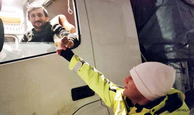 Zaman zaman yoğun kar yağışı nedeniyle kapatılan çevre yolarında mahsur kalan sürücülere polis ekipleri sıcak çorba ve kumanya ikramında bulundu.