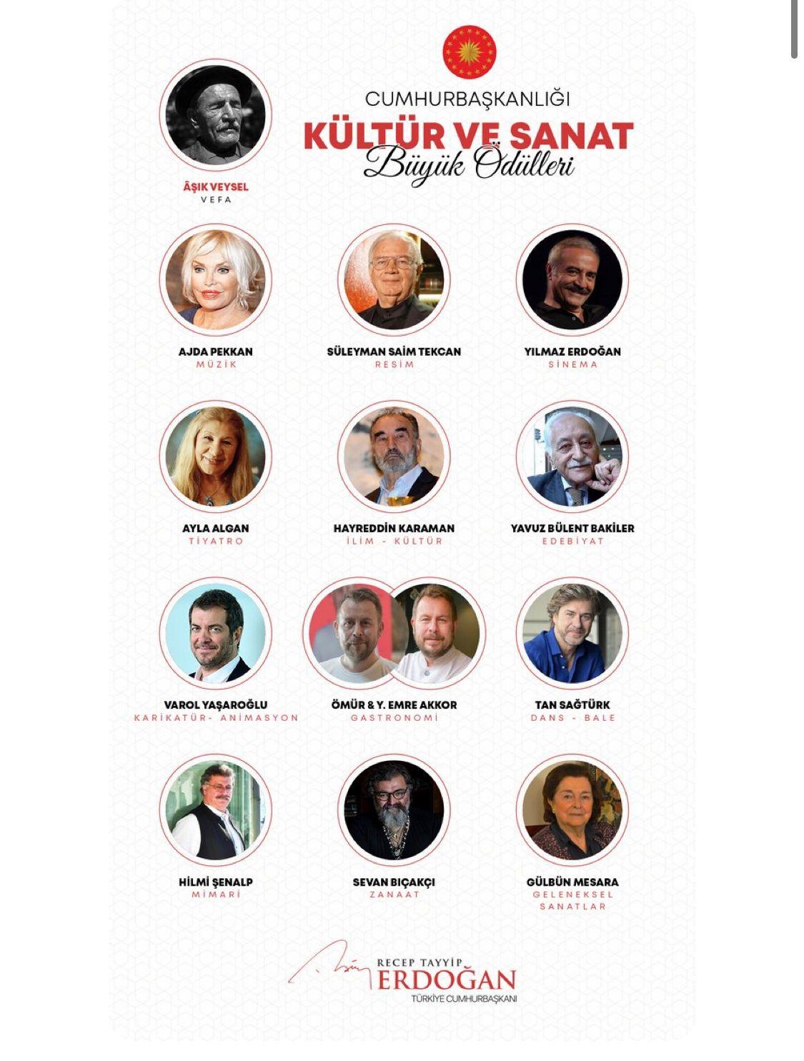 Cumhurbaşkanlığı Kültür ve Sanat Büyük Ödülleri’ne; müzik alanında Ajda Pekkan, resim alanında Süleyman Saim Tekcan, sinema alanında Yılmaz Erdoğan, tiyatro alanında Ayla Algan, ilim-kültür alanında Hayreddin Karaman, edebiyat alanında Yavuz Bülent Bakiler, karikatür-animasyon alanında Varol Yaşaroğlu, gastronomi alanında Ömür Akkor ve Emre Akkor, dans-bale alanında Tan Sağtürk, mimari alanda Hilmi Şenalp, zanaat alanında Sevan Bıçakçı, geleneksel sanatlar alanında Gülbün Mesera, "Vefa Ödülü"ne ise Aşık Veysel değer görüldü.İstanbul’daki 15 Temmuz şehitler anıtı ve Konya Atatürk stadına yapılmakta olan millet bahçesindeki caminin de mimarı olan Konyalı mimar Hilmi Şenalp, Av. Hasip Şenalp'in de kardeşi.