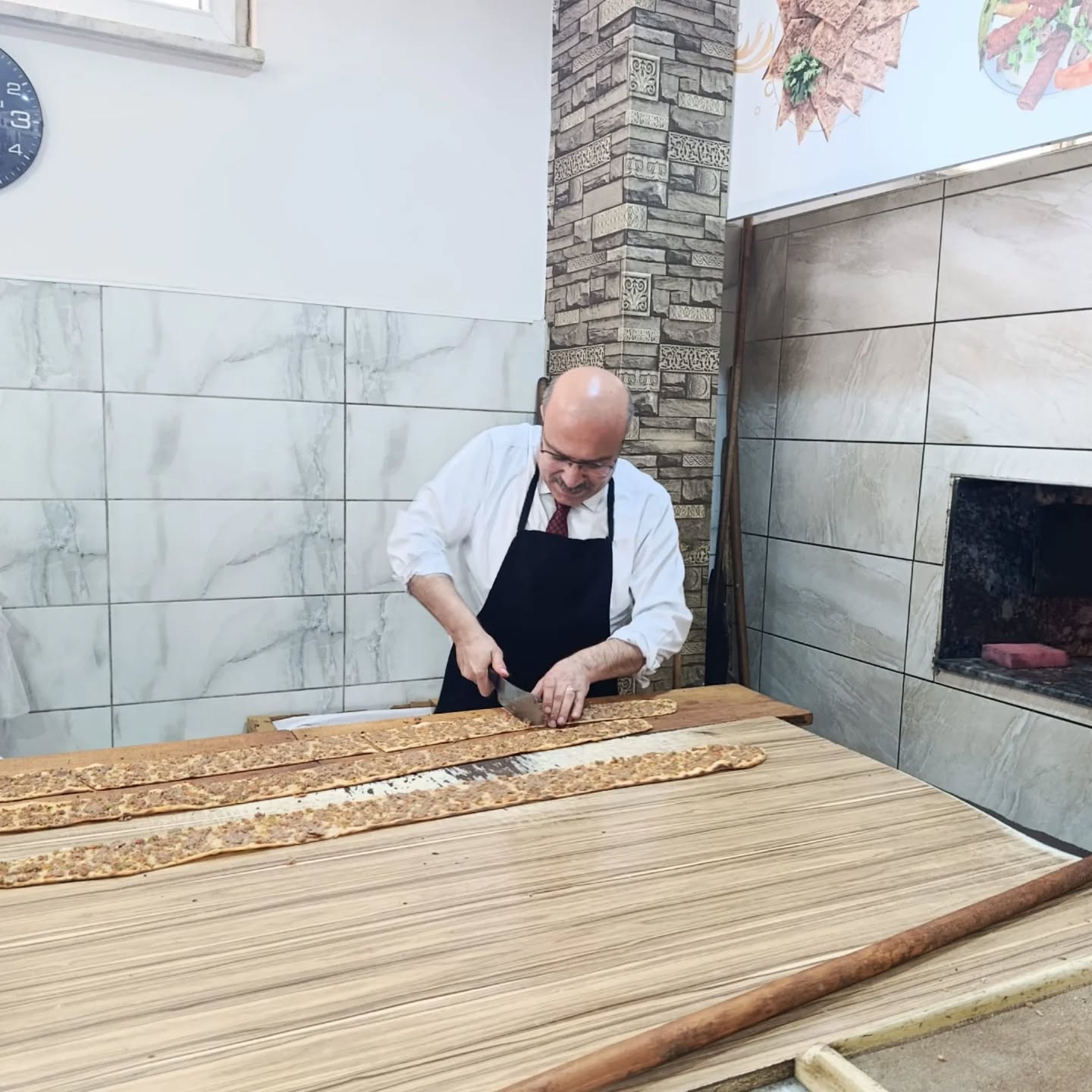 MUTFAKTA TAM MESAİ: HAMURDAN KÜREĞESadece bir ziyaretle yetinmeyen Kadir Ulusoy, önlüğünü takarak fırının mutfak bölümüne geçti.Ustalara taş çıkartan bir performans sergileyen konya Milletvekili; hamurun açılmasından kıymanın harmanlanmasına kadar her sürece bizzat dahil oldu.Hazırladığı etliekmekleri fırın küreğiyle ateşle buluşturan Ulusoy, ocak başında ustalara eşlik ederek hünerlerini sergiledi.