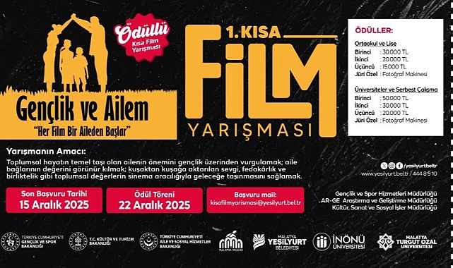 Yeşilyurt Belediyesi, İnönü Üniversitesi ve Turgut Özal Üniversitesi iş birliğinde, "2025 Aile Yılı" etkinlikleri kapsamında düzenlenen ödüllü 1. Kısa Film Yarışması için başvurular devam ediyor. "Gençlik ve Ailem" konusuyla gerçekleştirilecek yarışmanın son başvuru tarihi 15 Aralık 2025 olarak açıklandı. Ödül töreni ise 22 Aralık’ta düzenlenecek.