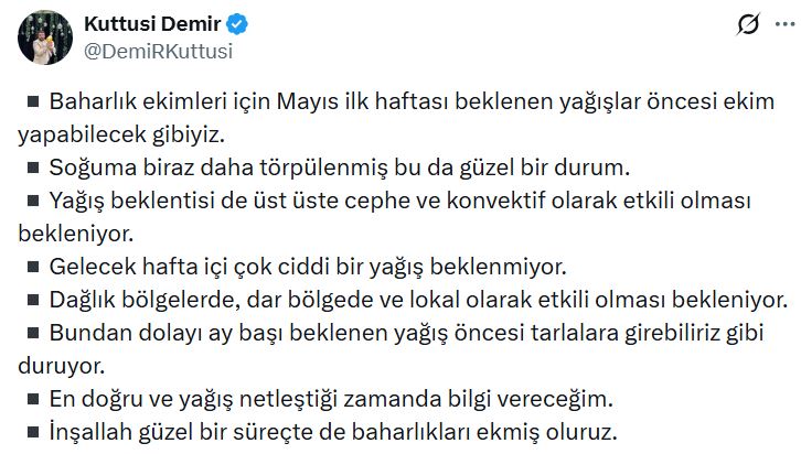 LOKAL YAĞIŞLAR VE DAĞLIK BÖLGELERHaftalık tahminlerinde dar bölgelere dikkat çeken Kuttusi Demir, yağışların her yerde aynı anda değil, daha çok dağlık kesimlerde ve lokal olarak etkili olacağını belirtti.Demir, şunları kaydetti:"Baharlık ekimleri için Mayıs ilk haftası beklenen yağışlar öncesi ekim yapabilecek gibiyiz. Gelecek hafta içi çok ciddi bir yağış beklenmiyor. Dağlık bölgelerde, dar bölgede ve lokal olarak etkili olması bekleniyor. Bundan dolayı ay başı beklenen yağış öncesi tarlalara girebiliriz gibi duruyor."ÇİFTÇİ GÖZÜNÜ MAYIS’IN İLK HAFTASINA DİKTİMayıs ayının başlamasıyla birlikte yağışların karakter değiştirmesi bekleniyor. Hem cephe yağışlarının hem de konvektif (yükselim) yağışların üst üste etkili olacağı tahmin edilirken, Demir sürecin takipçisi olacağını belirtti. "En doğru ve yağış netleştiği zamanda bilgi vereceğim" diyen uzman, inşallah güzel bir süreçte baharlıkların ekilmiş olacağı temennisinde bulundu.