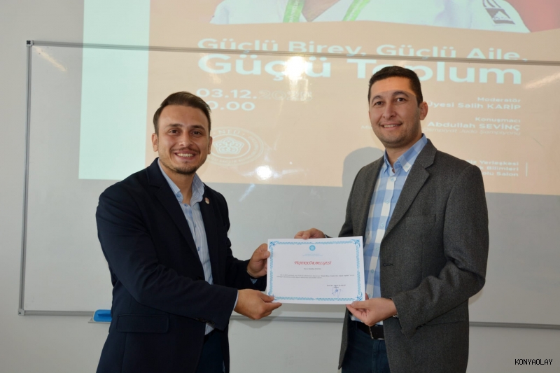 Necmettin Erbakan Üniversitesi (NEÜ) Nezahat Keleşoğlu Sağlık Bilimleri Fakültesi Sosyal Hizmet Bölümü tarafından, 3 Aralık Dünya Engelliler Günü kapsamında “Güçlü Birey, Güçlü Aile, Güçlü Toplum” konulu bir konferans düzenlendi. Konferansa, Konya Gençlik ve Spor İl Müdürlüğü bünyesinde yönetici olarak görev yapan ve 2017 İşitme Engelliler Olimpiyat Şampiyonu olan Abdullah Sevinç konuşmacı olarak katıldı.