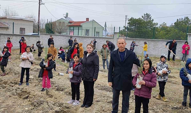 Konya’nın Karapınar ilçesinde ilkokul öğrencileri 250 adet fidanı toprakla buluşturdu.