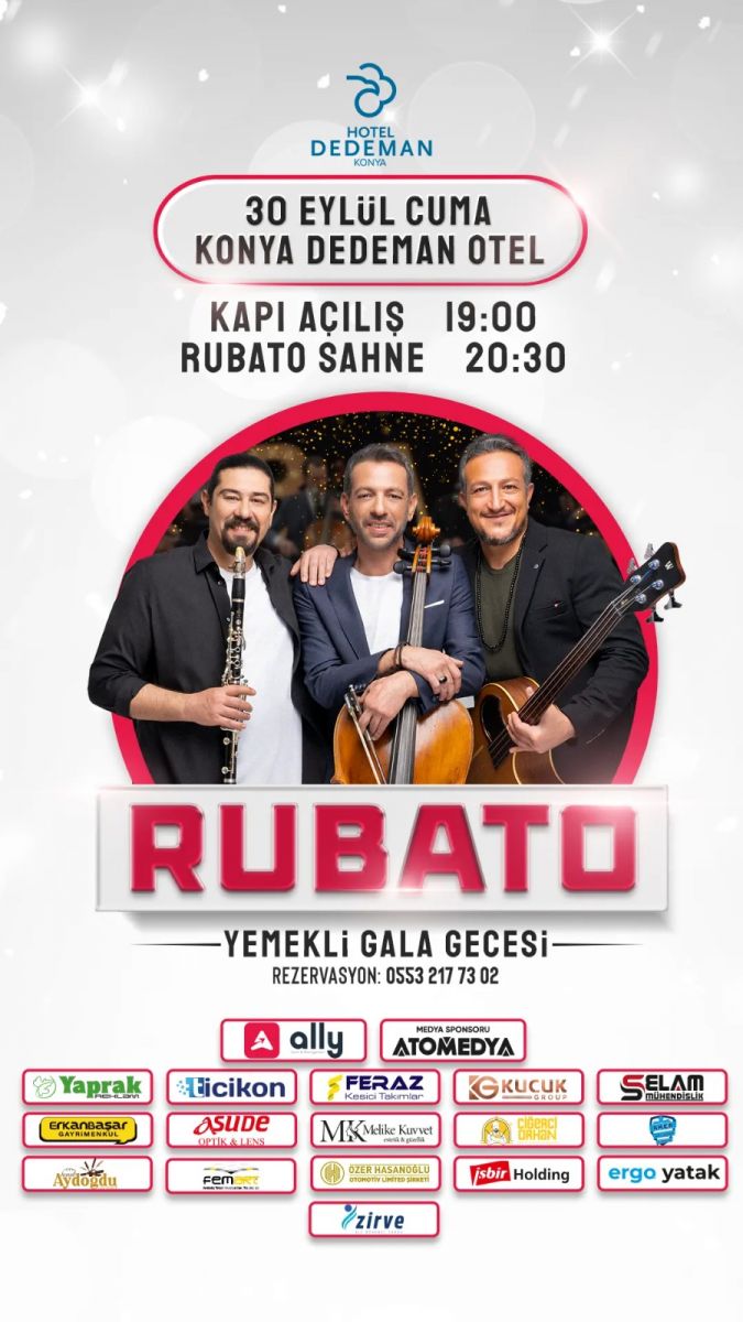 Konyalı genç girişimciler Çağatay Bilgin, Burak Tolunay Samancı ve Çağlar Bilgin’in kurduğu ve kısa sürede Türkiye’nin önde gelen organizasyon şirketleri arasına giren ALLY organizasyon Konya’da büyük bir konsere imza atma hazırlanıyor.Türkiye’nin her kesimi tarafından beğeni ile dinlenen sanatçı Rubato ile anlaşma sağlayan ALLY organizasyon 30 Eylül 2022 tarihinde Konya Dedeman otelde saat 20:30’da başlayacak olan Rubato konseri için tüm hazırlıklarını tamamladı. Sektöründe güçlü isimlerin sponsorluk yaptığı dev konserin medya sponsorluğunu ise yine Konyalı girişimciler tarafından kurulan ve kısa sürede Türkiye ve uluslar arası arenada söz sahibi olan ATOMEDYA üstleniyor. İlginin yoğun olduğu ve konsere biletlerin tükenmek üzere olduğu Konsere Konyalıların yanı sıra çevre illerden de yoğun talep olduğu öğrenildi.