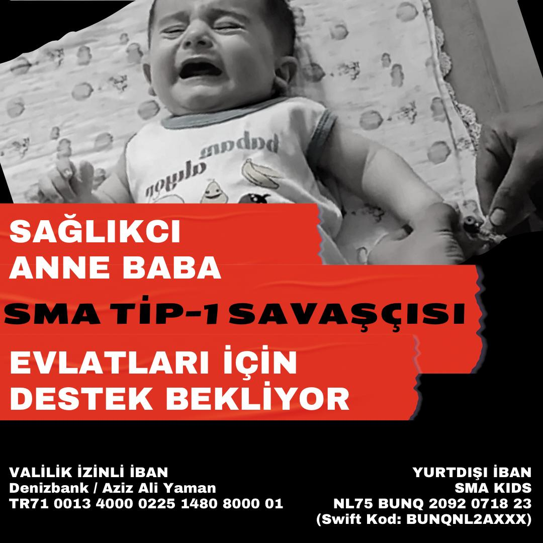 Baba Eyüp Yaman, "Oğlum Aziz Alin'in SMA Tip-1 hastalığının tedavisi sürüyor. Yapılan tetkikler sonucu Aziz Ali'nin 4. doz ilacını alması gerekiyor. Ancak şu ana kadar sadece 1 doz alabildi. SMA Tip 1 hastalığı zamanla kaslarını güçsüzleştirip, hayatını tehdit edeceği için 6 aylık olmadan yurtdışındaki kesin tedavi sağlayan ilacına ulaşması gerekiyor. Ancak, ilaç temini sağlanamıyor. Çocuğumu bu hastalıktan kaybetmek istemiyorum. Yavruma umut olacak ilacı temin edemedik. Aziz Ali'nin minik bedeniyle hastalıklarla savaştığını gördükçe içimiz yanıyor. Elimizden gelen bir şey yok. Sağlık Bakanımız Sayın Fahrettin Koca ve hayırseverlerden destek bekliyoruz" dedi.