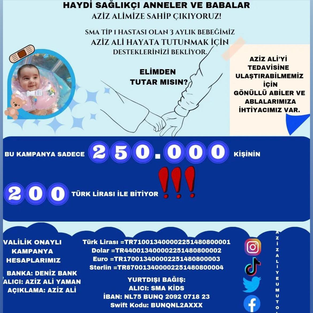 Eyüp ve Zeynep Yaman çiftinin ilk ve tek evladı Aziz Ali'ye daha 10 günlükken topuk kanından alınan örnek ile SMA Tip 1 ölümcül kas hastalığı teşhisi konuldu. 4 Aylık çocukları Aziz Ali'nin, kas gücünü koruması için Spinraza ilacının sadece bir dozunu alabilmiş. Aslında şu anda 4. dozunu alması gerekiyor ama ilaç temini sağlanamıyor ne yazık ki!SAĞLIKÇI AİLE "BİZ TÜM HASTALARA ŞİFA OLURKEN, KENDİ YAVRUMUZA ŞİFA OLAMIYORUZ"Adana Seyhan'da ikamet eden baba yoğun bakım hemşiresi Eyüp Yaman, Yüreğir Devlet Hastanesi'nde 3 yıldır görev yapıyor. Covid ve deprem zamanında sahada aktif çalışmış bir baba.