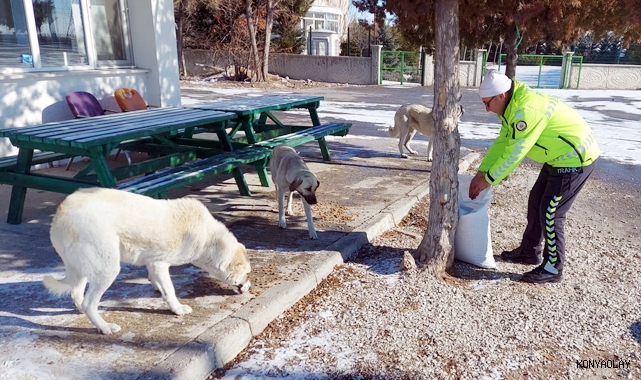 Konya İl Emniyet Müdürlüğü Bölge Trafik Denetleme Şube Müdürlüğü ekipleri zorlu kış şartlarında yiyecek bulmakta zorlanan sokak hayvanları için çalışmalarını sürdürüyor.