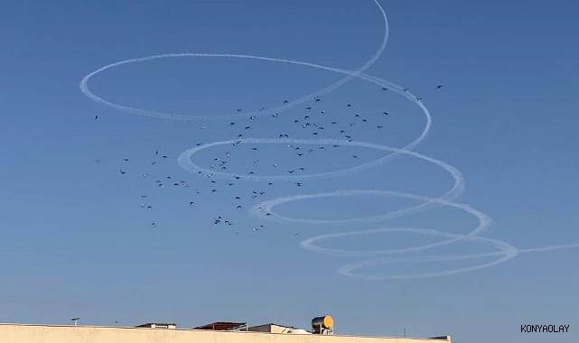 Suriye sınırında yer alan Şanlıurfa'nın Ceylanpınar ilçesinde gökyüzüne bakanlar ilginç bir görüntü ile karşılaştı. Sınır hattı boyunca ilerleyen savaş uçağı olduğu öne sürülen uçağın geride bıraktığı şekiller vatandaşlarda büyük bir merak uyandırdı.