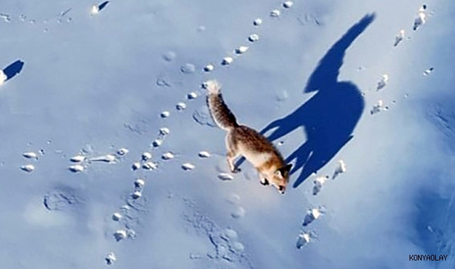 Kar üstünde yiyecek arayan tilki dron ile görüntülendi