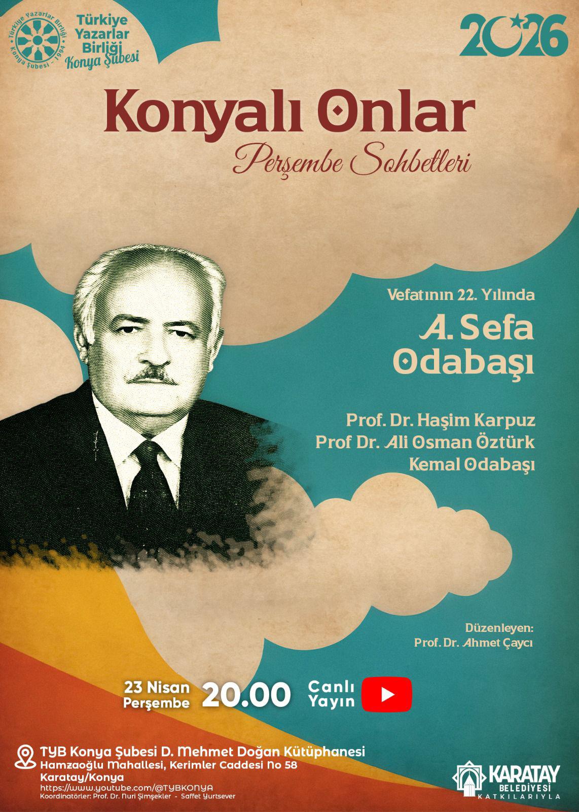Prof. Dr. Ahmet Çaycı’nın düzenlediği programa konuşmacı olarak Prof. Dr. Haşim Karpuz, Prof. Dr. Ali Osman Öztürk ve Kemal Odabaşı katılarak, Konya’nın önemli hafızalarından biri olan merhum araştırmacı-yazar A. Sefa Odabaşı’nın hayatını ve şehre hizmetlerini paylaştılar.Konya Kültürünün "Çelebi" İsmi: Sefa OdabaşıTYB Konya Şube Başkanı Ahmet Köseoğlu, Sefa Odabaşı’nın nezaketi ve şahsiyetine vurgu yaparak, onun şehre olan hizmetlerini şu sözlerle anlattı: