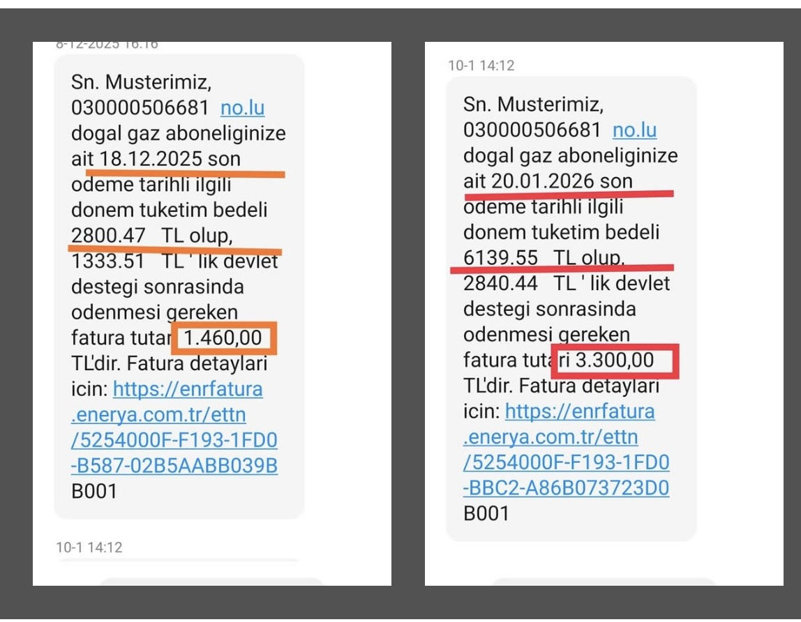Birincisinde Aralık ayına ait tüketim bedeli 1460 TL iken, ikincisinde bir sonraki Ocak ayının tüketim bedeli 3300 TL...